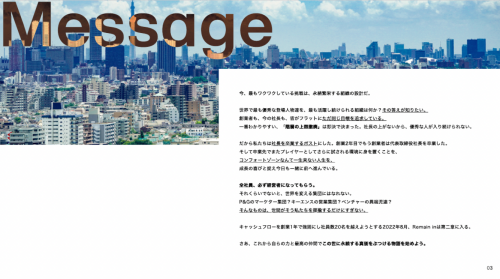 「カルチャーデック」で示しているのは、Remain in の価値観と思想です。現在の状況を打開し、思い描く人生を自分の手で掴みたいと考えているならば、「まぶしく働く」環境は用意しています。